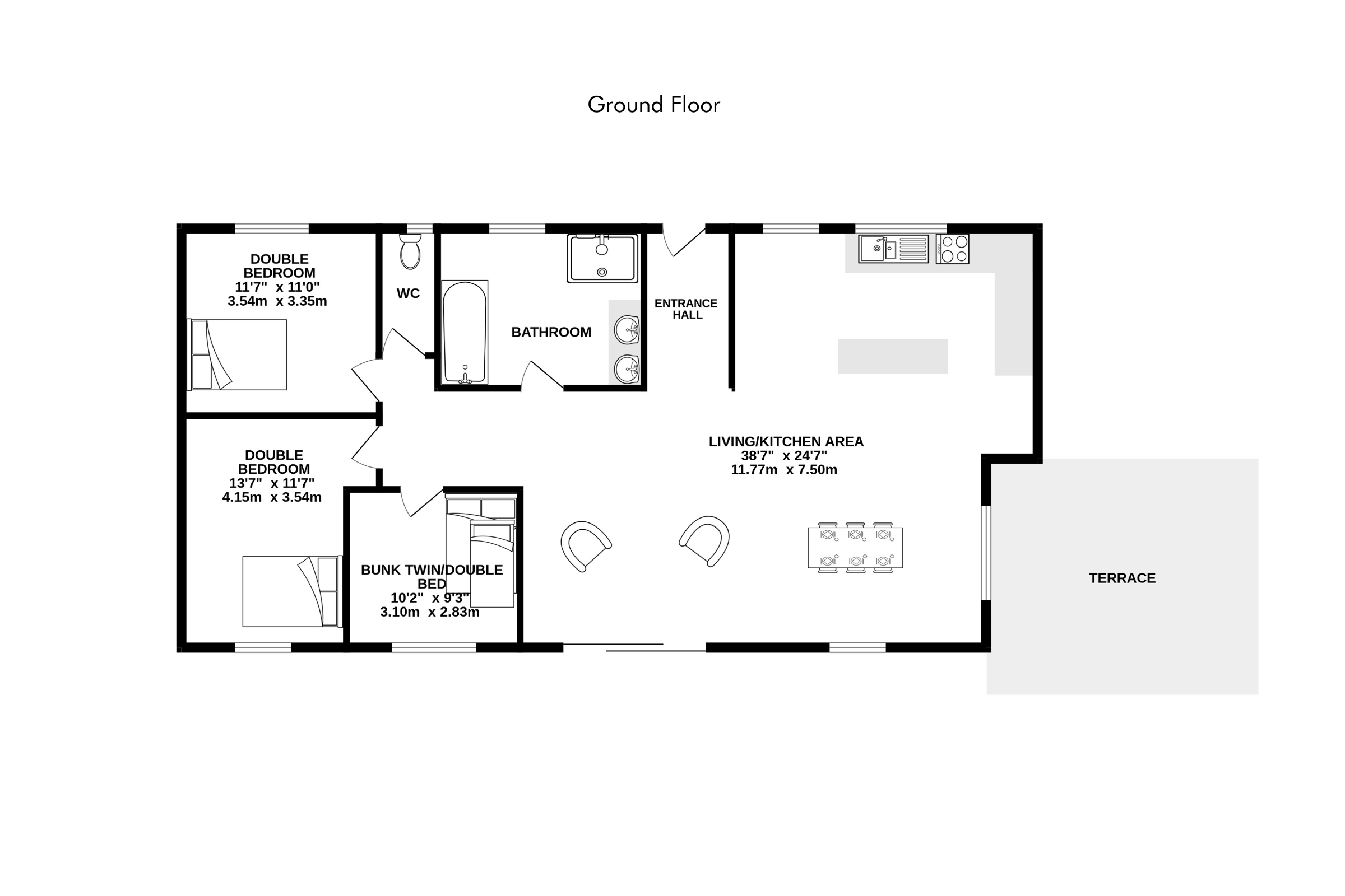 - Open plan kitchen/dining/living area with Smart TV; leads to terrace